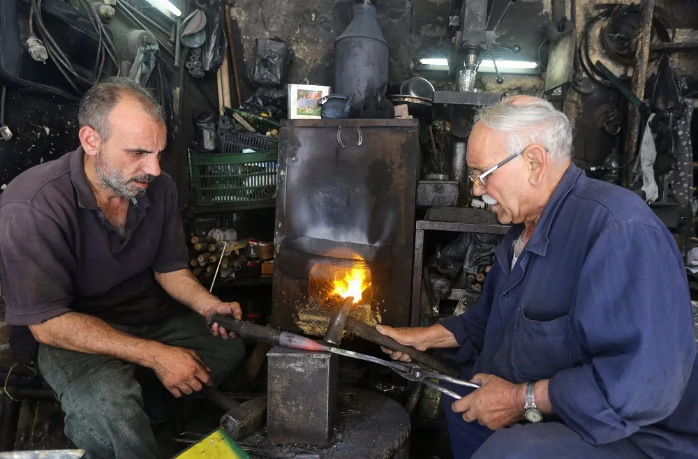 Syrian blacksmiths forge a cleaver in their workshop in the old city of the capital Damascus, on June 6, 2022. (AFP)