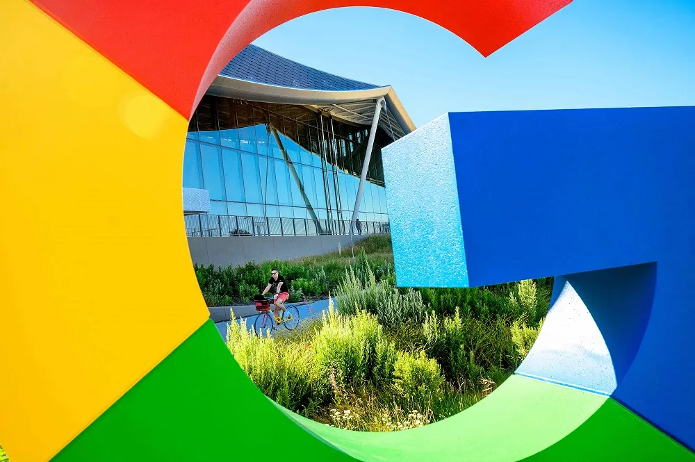 A bicyclist rides along a path at Google's Bay View campus in Mountain View, California on June 27, 2022. (AFP)