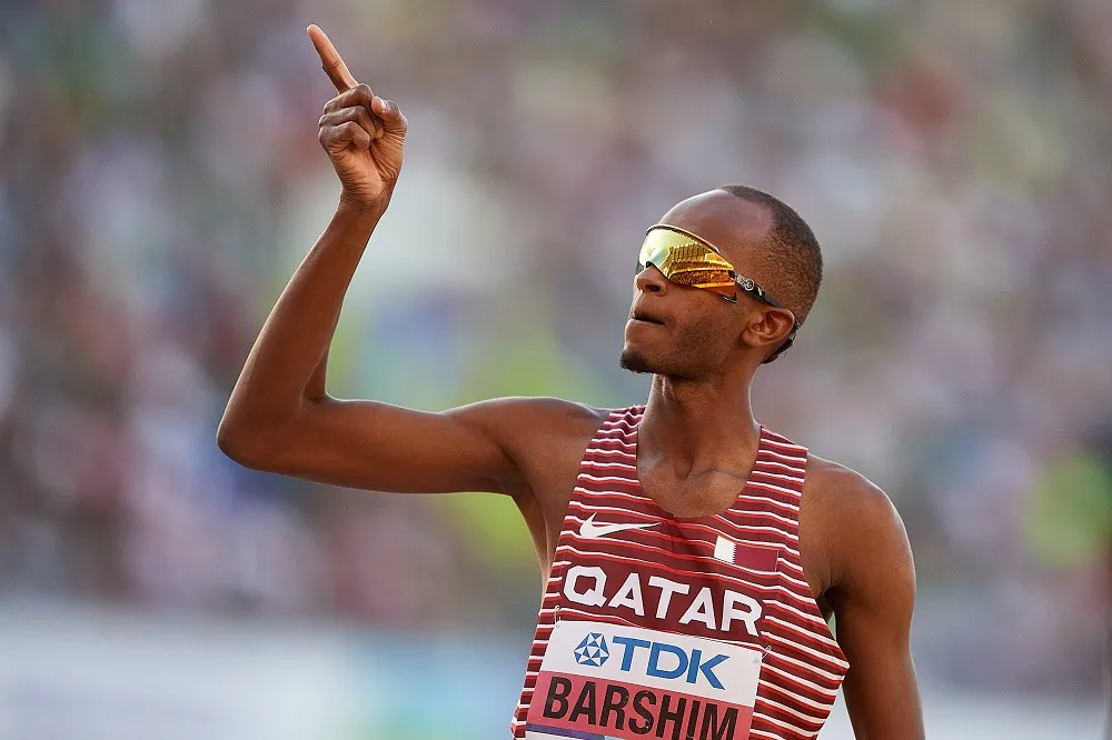The "Qatari Falcon," flapped his arms to celebrate after clearing 2.35 meters (7-8 1/2) on his first attempt, but was more subdued when he cleared 2.37 (7-9).