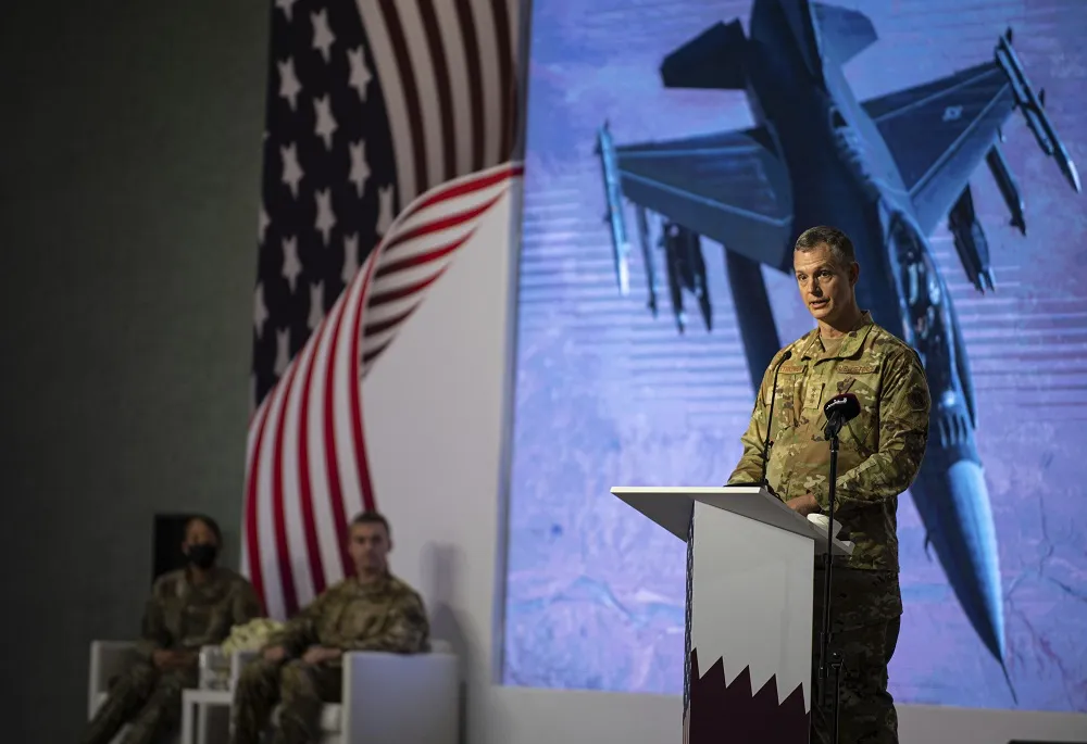 In this photo provided by the US Air Force, US Air Force Lt. Gen. Alexus G. Grynkewich, incoming Ninth Air Force (Air Forces Central) commander, delivers a commemorative speech during a change of command ceremony at Al Udeid Air Base, Qatar, Thursday, July 21, 2022. (US Air Force via AP)