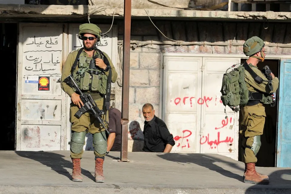 Israeli soldiers stand while stationed outside a Palestinian shop in Huwara, Israeli-occupied West Bank, May 26, 2022. REUTERS/Raneen Sawafta