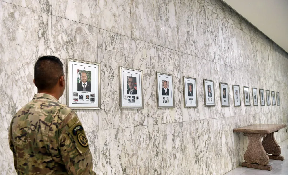 A Lebanese army member looks at pictures of former Lebanese presidents at Baabda Palace, east of Beirut, Lebanon, 01 November 2022. (EPA)