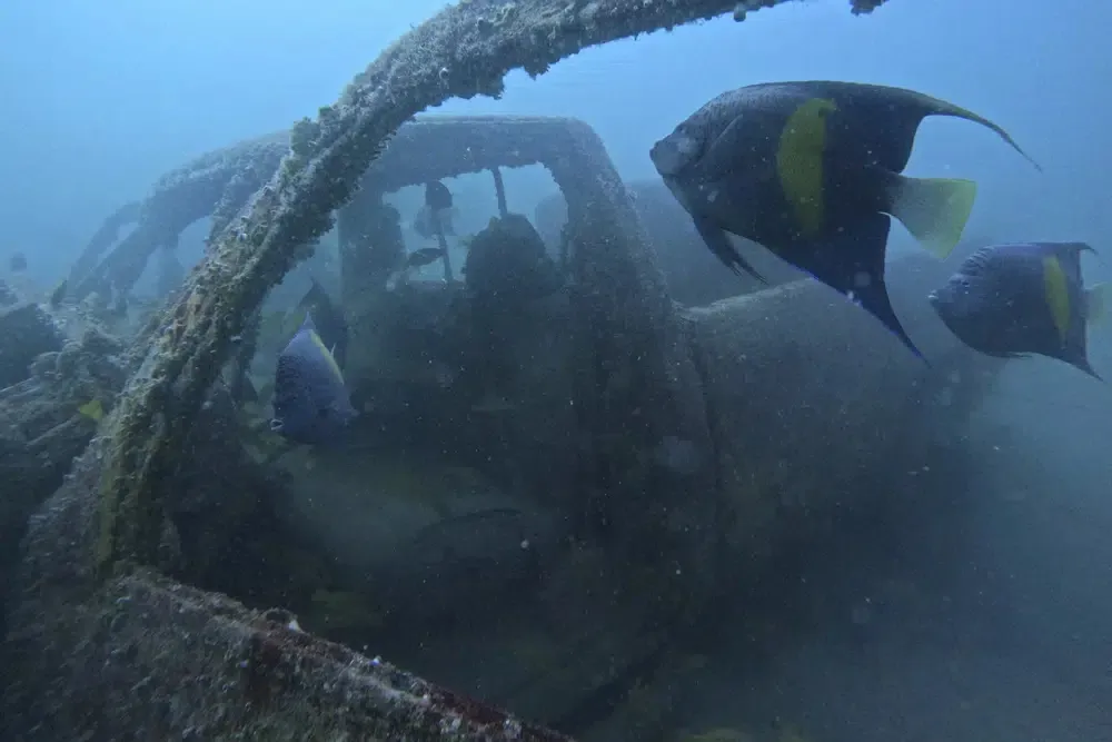 Blue angel fish swim around a sunken vehicle in the Mesaieed sea-line at the GMC dive site in Mesaieed, Qatar Wednesday, Nov. 30, 2022 (AP)
