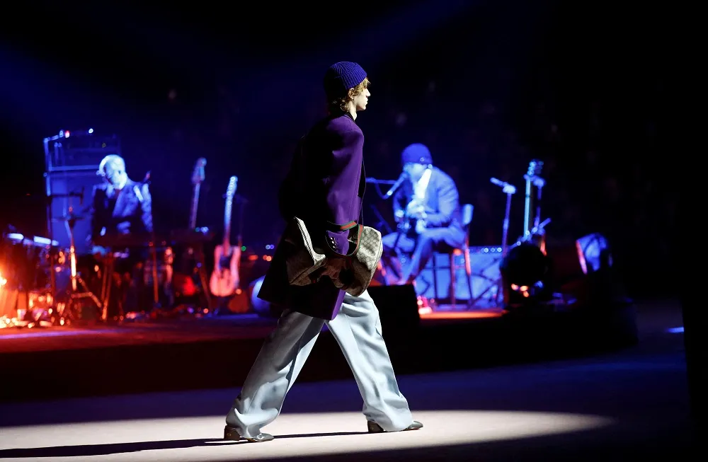 Models circled a darkened room to the growling music of live band Marc Ribot's Ceramic Dog, parading oversize suit coats with wide lapels and ample, pleated trousers in pale beige and pastel tones, with new renditions of house classics, along with reminders of Michele's tenure, including furry, horse-bit embellished slippers.