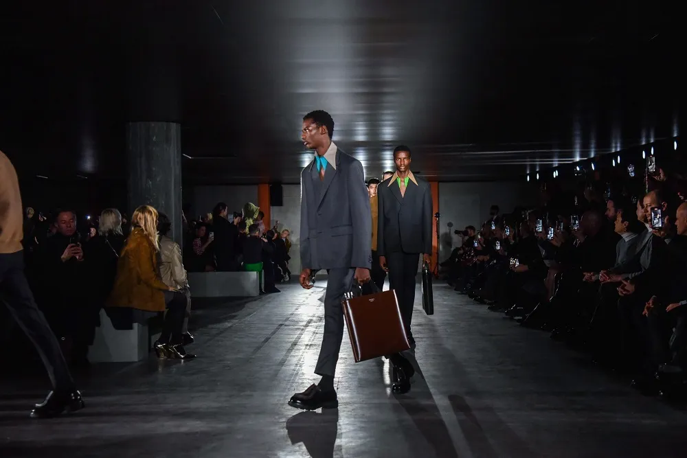 The ceiling on the darkened Prada showroom rose to reveal industrial chandeliers as the first looks appeared on the runway: tailored, slightly blocky suit jackets with sharp, wing-like collars that flapped gently with each step, secured and cushioned by just a wisp of colorful knitwear.
