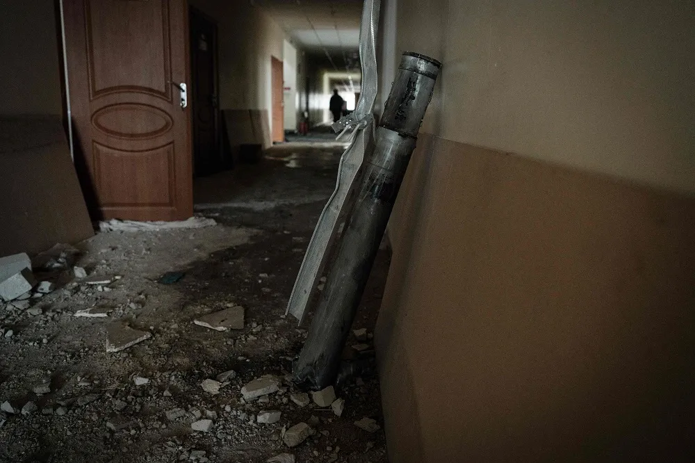 A part of a rocket that penetrated the rooftop overnight remains at a corridor of an elementary school in Chasiv Yar on January 28, 2023, amid the Russian invasion of Ukraine. (AFP)