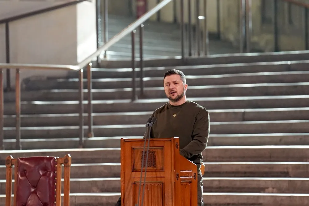 Ukrainian President Volodymyr Zelenskiy addresses parliamentarians during his first visit to the UK since the Russian invasion of Ukraine in Westminster Hall, London, Britain, February 8, 2023. (Reuters)