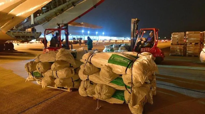 The first aircraft is loaded with 90 tons of food baskets, shelters, blankets and medical supplies, such as solutions, medicine for chronic diseases and painkillers.