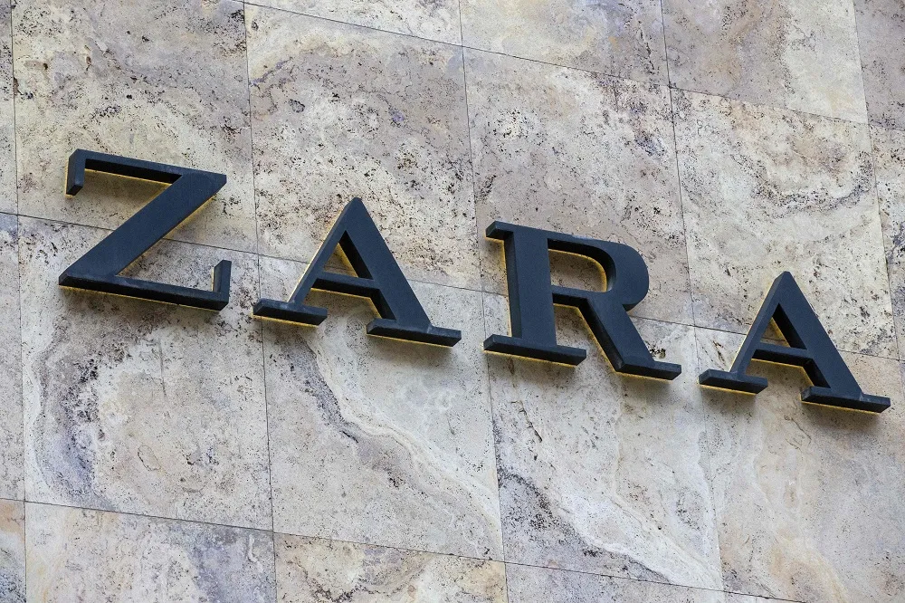 This photograph shows the logo of Zara retail clothing chain on a store building in Brussels on February 18, 2023. (AFP)