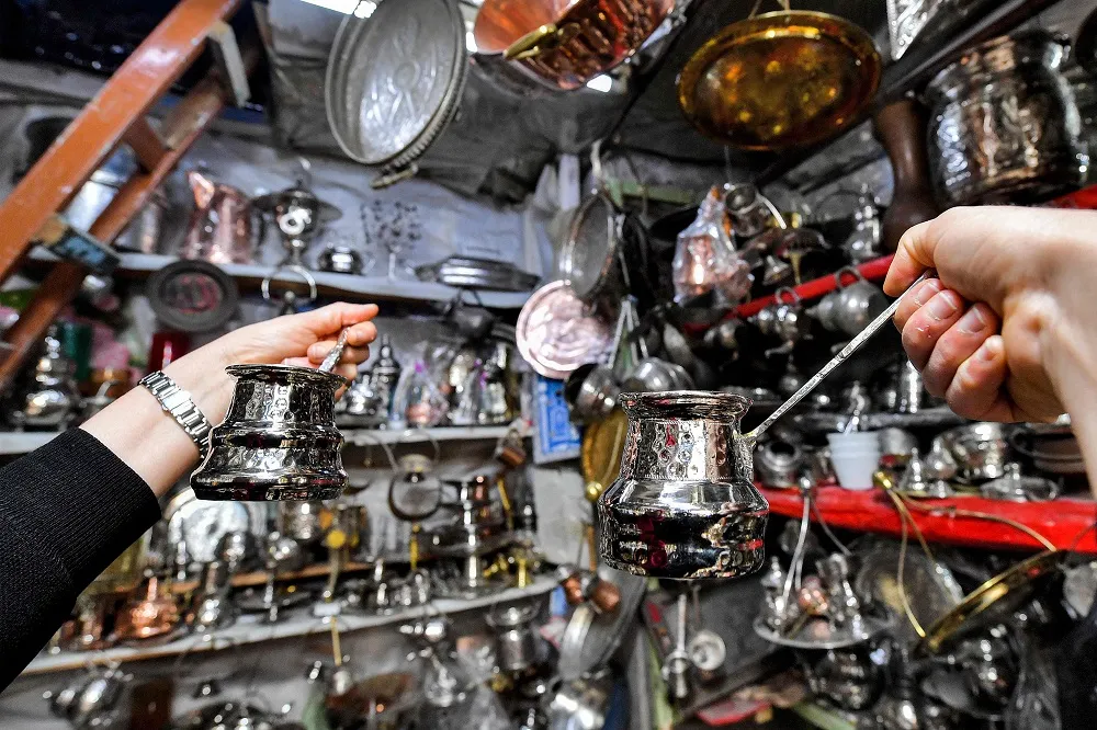 Trade is also brisk for beautiful old pieces in the Souk En-Nahhas (copper market) where around 50 shops sell reconditioned coffee makers, teapots, incense burners and small cups.