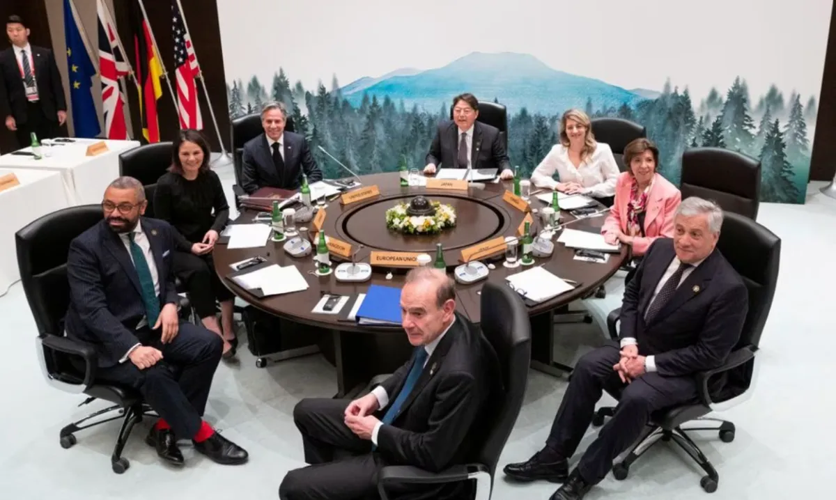 British Foreign Secretary James Cleverly, German Foreign Minister Annalena Baerbock, US Secretary of State Antony Blinken, Japan's Foreign Minister Yoshimasa Hayashi, Canadian Foreign Minister Melanie Joly, French Foreign Minister Catherine Colonna, Italy's Foreign Minister Antonio Tajani, and Deputy Secretary-General of the European External Action Service (EEAS) Enrique Mora pose for photographs at the start of the fifth working session of a G7 Foreign Ministers' Meeting at the Prince Karuizawa hotel in Karuizawa on April 18, 2023. YUICHI YAMAZAKI/Pool via REUTERS