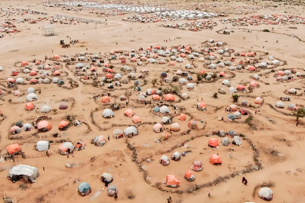 This aerial view shows makeshift structures of people displaced by drought at the Ladan internally displaced people (IDP) camp in Dolow on May 1, 2023. (AFP)