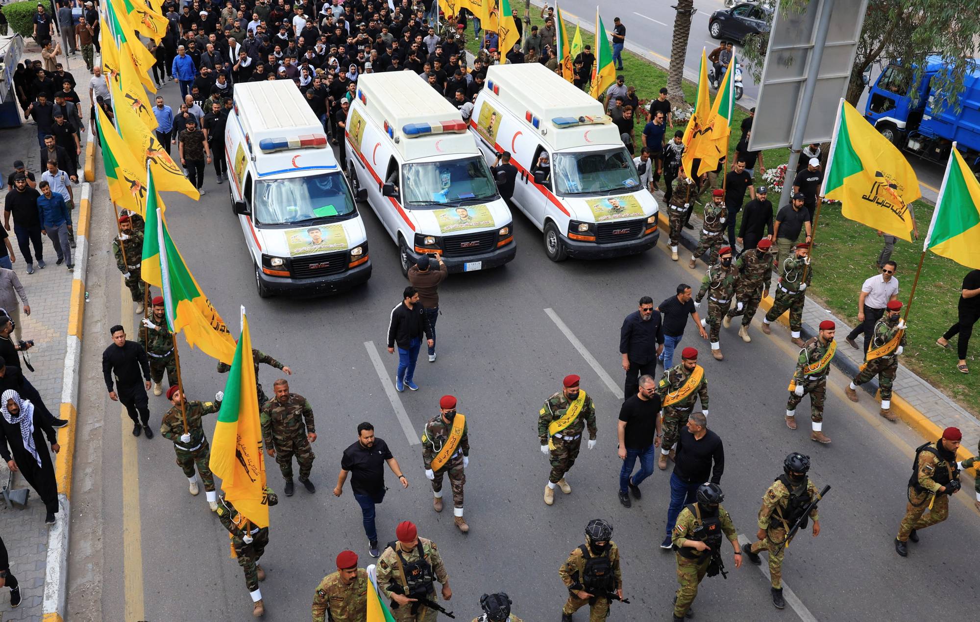Mourners attend the funeral of fighters with Iraq’s Popular Mobilisation Forces who were killed in an airstrike, in Baghdad, Iraq, April 8, 2026. REUTERS/Thaier Al-Sudani