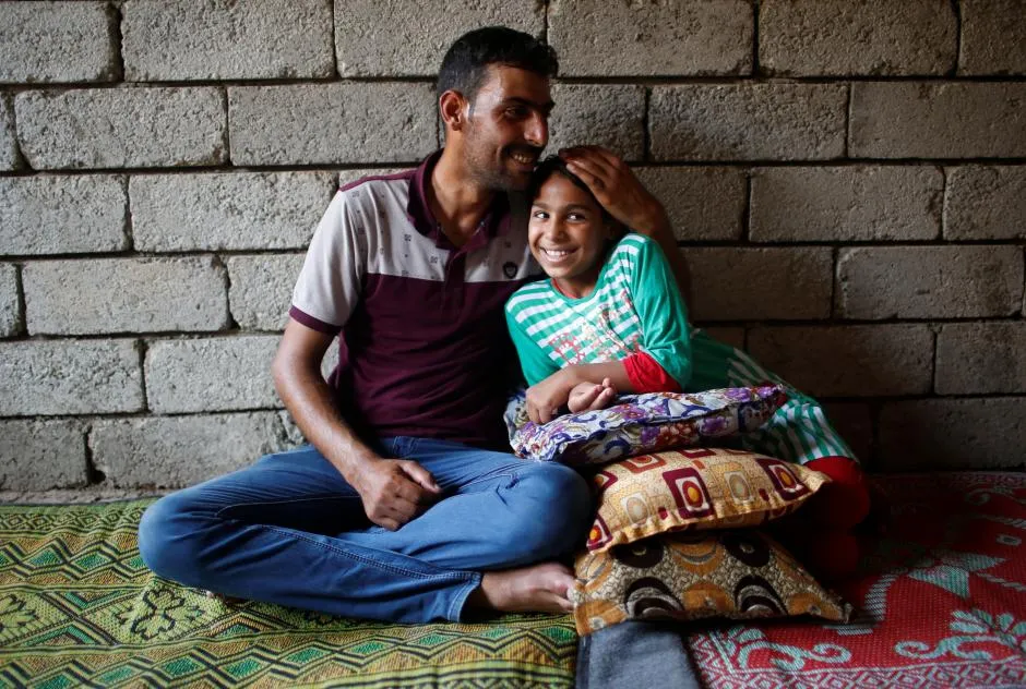 Nine-year-old Iraqi girl Meriam smiles as she sits next to her father Hassan in a house, east of Mosul, Iraq July 28, 2017. Picture taken July 28, 2017. REUTERS/Suhaib Salem