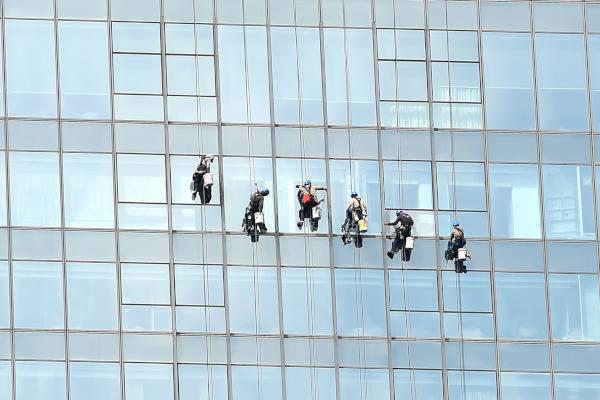 Workers clean the glass wall of a newly built skyscraper in Phnom Penh on March 5, 2019. (Photo by TANG CHHIN Sothy / AFP)