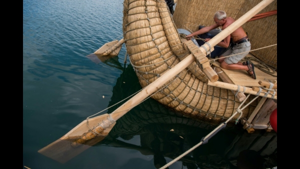 An Abora IV expedition member works on the 14-meter long sailing reed boat as the team set-off on a voyage from the port of Varna AFP / NIKOLAY DOYCHINOV