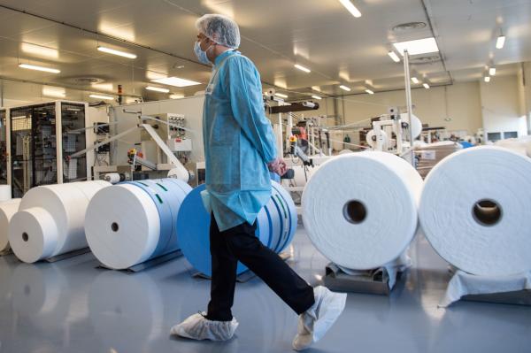 French President Emmanuel Macron wearing protective suit and face mask visits the Kolmi-Hopen protective face masks factory in Saint-Barthelemy-d'Anjou near Angers, central France, on March 31, 2020 amid a new coronavirus (COVID-19) pandemic. AFP
