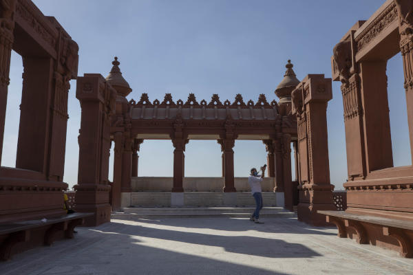 A man photographs the Baron Empain Palace, during the opening after its reconstruction in Heliopolis, Cairo, Egypt, Tuesday, June 30, 2020. (AP Photo/Nariman El-Mofty)