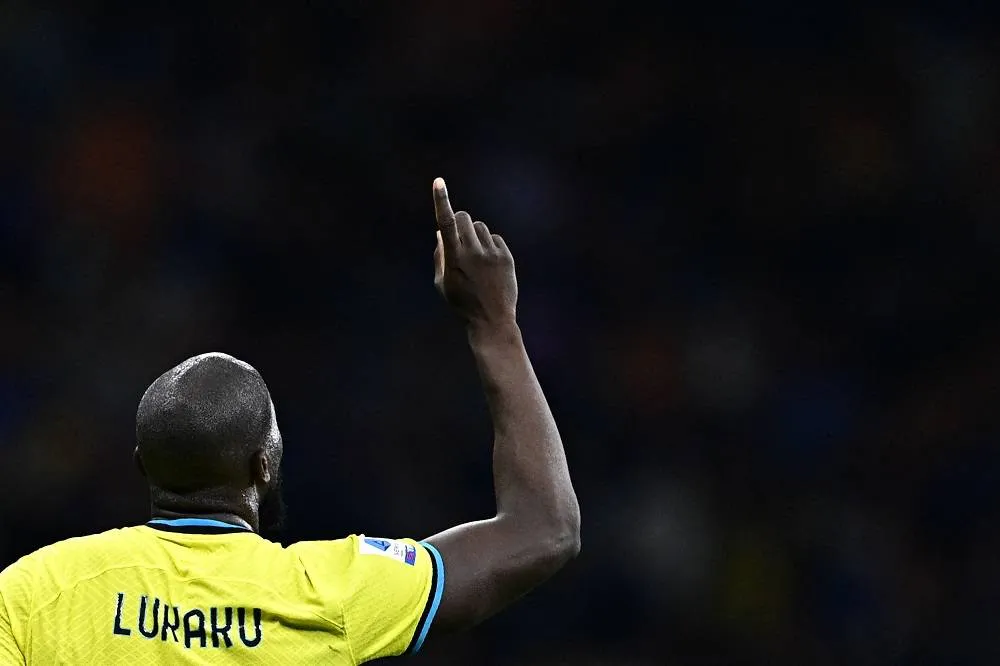 Inter Milan's Belgian forward Romelu Lukaku celebrates after scoring his side's fourth goal during the Italian Serie A football match between Inter and Sassuolo on May 13, 2023 at the Giuseppe-Meazza (San Siro) stadium in Milan. (AFP)