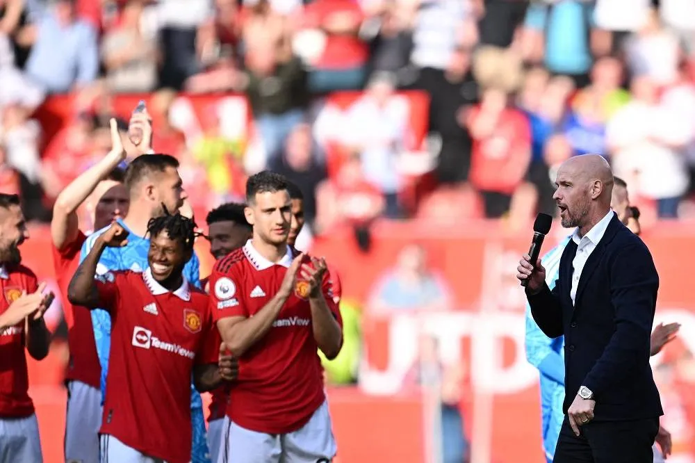 Manchester United's Dutch manager Erik ten Hag speaks to his players at the end of the English Premier League football match between Manchester United and Fulham at Old Trafford in Manchester, northwest England, on May 28, 2023. (AFP)