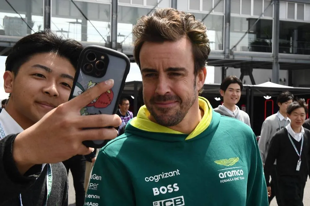 Aston Martin's Spanish driver Fernando Alonso (R) poses for a picture with a fan in the paddock preparing for the April 7 Formula One Japanese Grand Prix race at the Suzuka circuit in Suzuka, Mie prefecture on April 4, 2024. (AFP)
