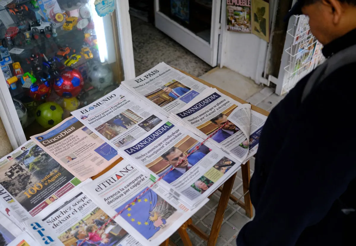 A man looks at the front pages of Spanish newspapers reporting Prime Minister Pedro Sanchez's decision to suspend public duties after the court launched a preliminary investigation into his wife Begona Gomez, at a newspaper shop in Barcelona, Spain. REUTERS/Nacho Doce