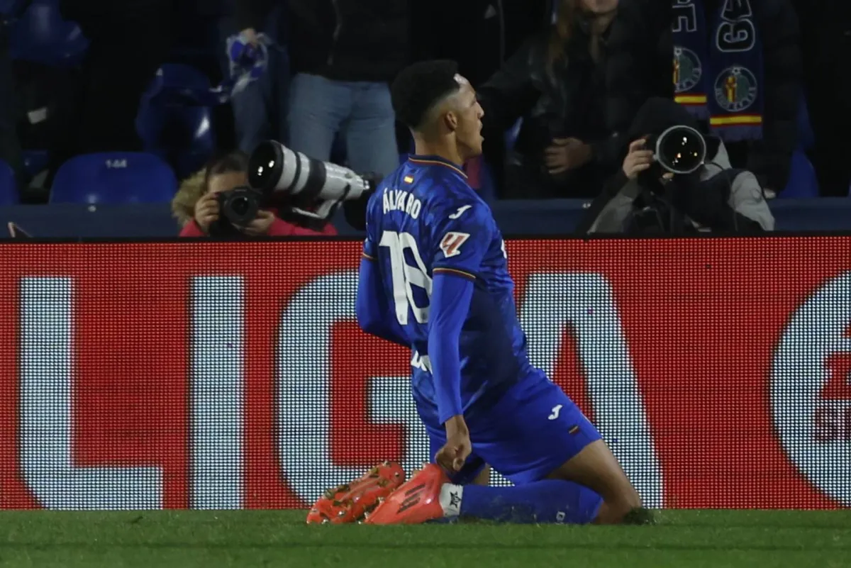 Getafe's forward Alvaro Rodriguez celebrates after scoring the opening goal during the LaLiga match between Getafe and Real Valladolid at Coliseo stadium in Getafe, Spain, 22 November 2024. EPA/JUANJO MARTIN