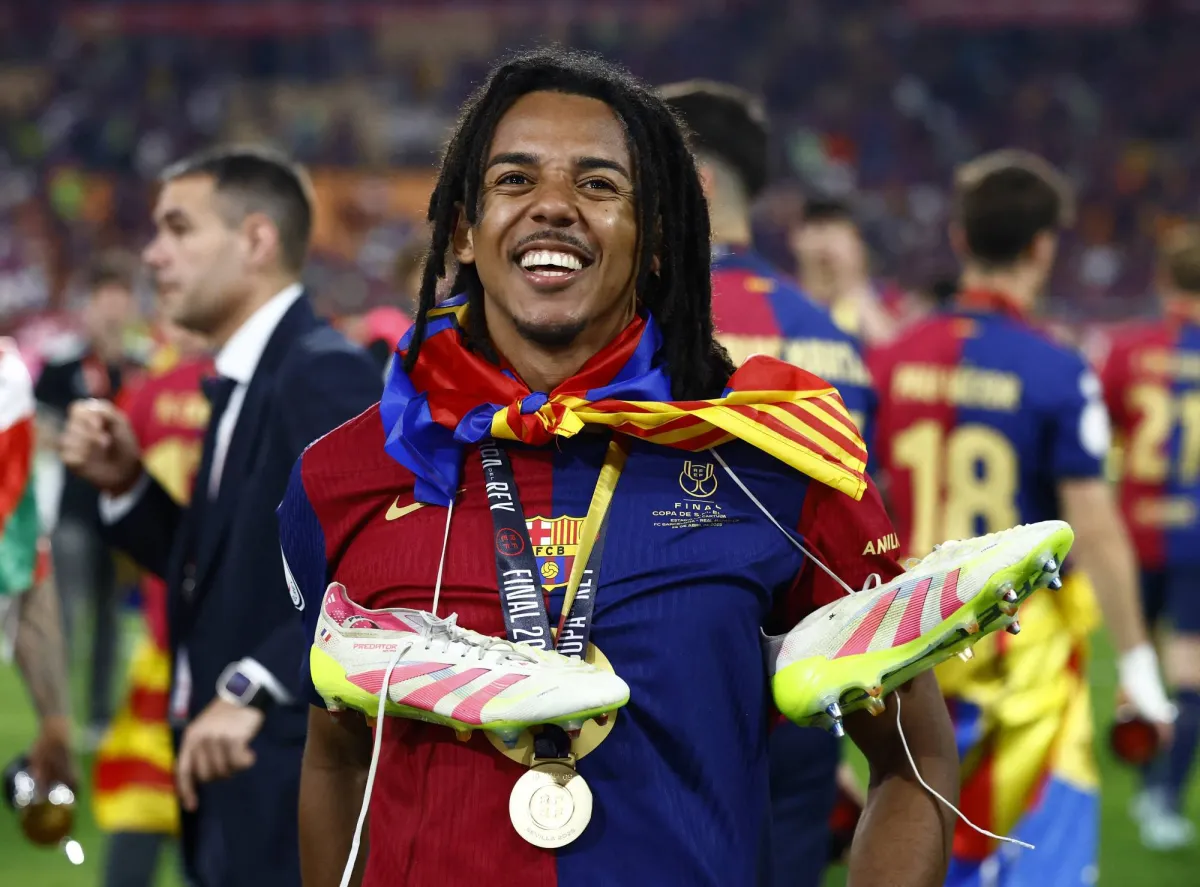 Soccer Football - Copa del Rey - Final - FC Barcelona v Real Madrid - Estadio de La Cartuja, Seville, Spain - April 26, 2025 FC Barcelona's Jules Kounde celebrates after winning the Copa del Rey REUTERS/Borja Suarez