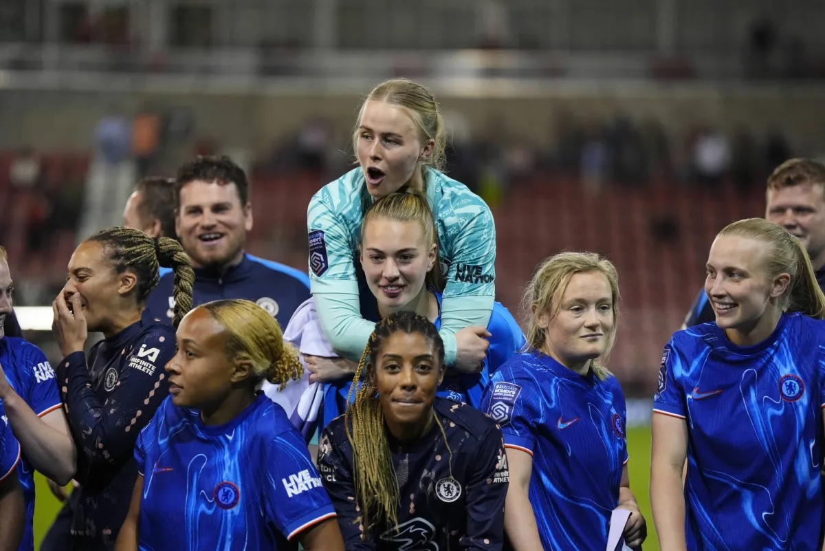 30 April 2025, United Kingdom, Manchester: Chelsea celebrate as they win the league after the Barclays Women's Super League match against Manchester united at Leigh Sports Village, Manchester. Photo: Nick Potts/PA Wire/dpa