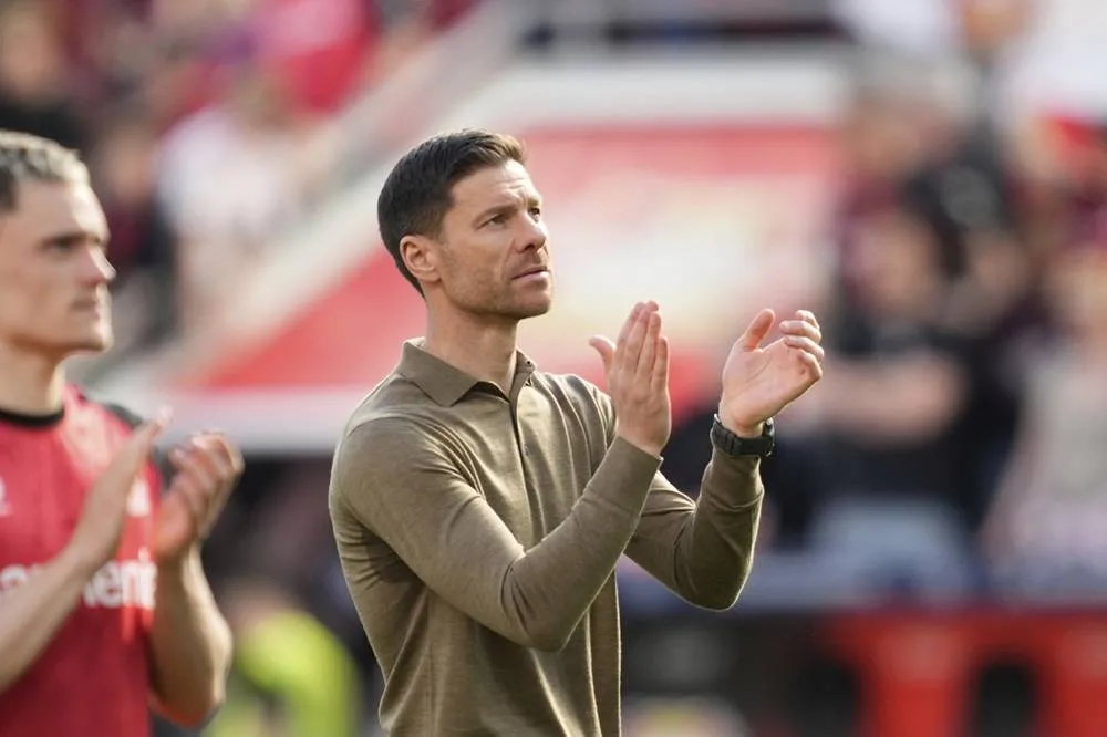Leverkusen's head coach Xabier Alonso celebrates at the end of the German Bundesliga soccer match between Bayer Leverkusen and FC Augsburg at the BayArena in Leverkusen, Germany, Saturday, April 26, 2025. (AP)