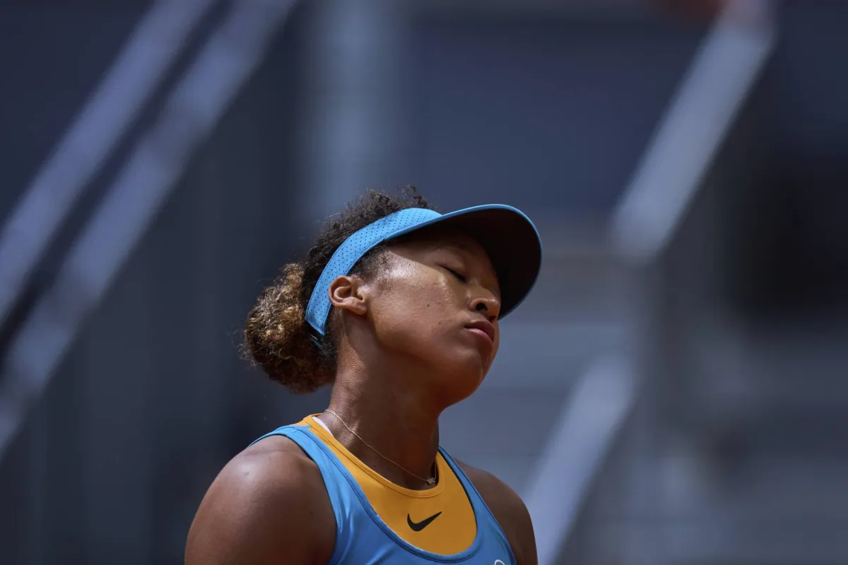 Naomi Osaka, of Japan, reacts during her match against Lucia Bronzetti, of Italy, at the Madrid Open tennis tournament in Madrid, Spain, Tuesday, April 22, 2025. (AP Photo/Manu Fernandez)