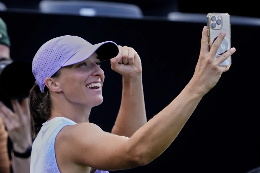 Poland's Iga Swiatek takes a selfie after her match against Russia's Ekaterina Alexandria in their quarterfinal match at the WTA tennis tournament in Bad Homburg, Germany, Thursday, June 26, 2025. (AP)