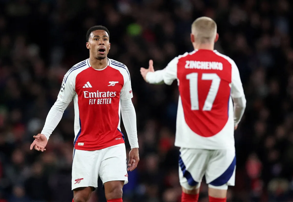FILE PHOTO: Soccer Football - Champions League - Round of 16 - Second Leg - Arsenal v PSV Eindhoven - Emirates Stadium, London, Britain - March 12, 2025 Arsenal's Gabriel Magalhaes and Oleksandr Zinchenko REUTERS/David Klein/File Photo
