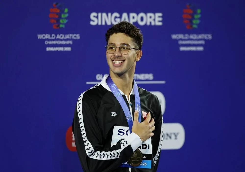 Swimming - World Aquatics Championships - Men 1500m Freestyle - World Aquatics Championships Arena, Singapore - August 3, 2025 Gold medalist Tunisia's Ahmed Jaouadi celebrates on the podium. (Reuters)