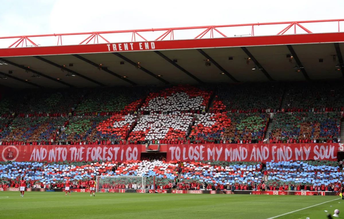 Soccer Football - Premier League - Nottingham Forest v Brentford - The City Ground, Nottingham, Britain - August 17, 2025 Nottingham Forest fans makes a display in the stands before the match REUTERS/Jaimi Joy