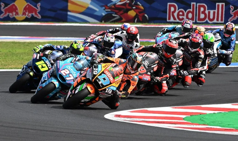 Misano World Circuit Marco Simoncelli, Misano, Italy - September 14, 2025 CFMOTO Inde Aspar Team's Daniel Holgado, Sync SpeedRS Team's Celestino Vietti and Italtrans Racing Team's Diogo Moreira in action during the Moto2 race. (Reuters)