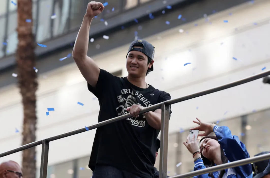 Nov 3, 2025; Los Angeles, CA, USA; Los Angeles Dodgers two-way player Shohei Ohtani acknowledges the crowd during the World Series championship parade at downtown Los Angeles. Mandatory Credit: Kiyoshi Mio-Imagn Images