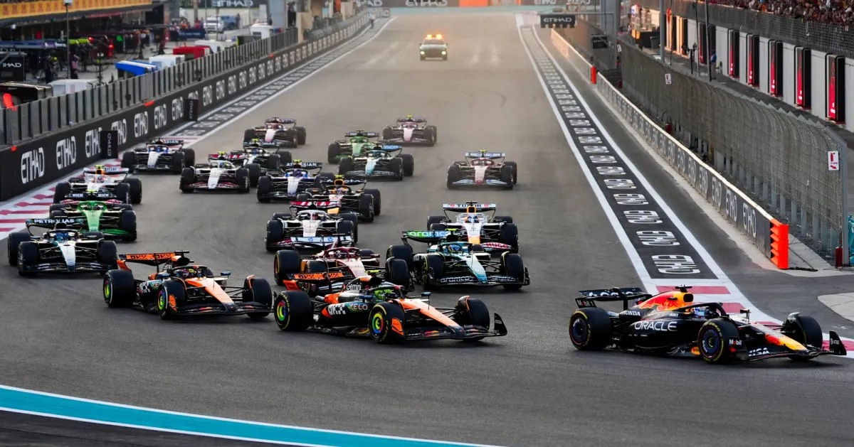 12 July 2025, United Arab Emirates, Abu Dhabi: Red Bull driver Max Verstappen leads into turn one during the Abu Dhabi Grand Prix at the Yas Marina Circuit, Abu Dhabi. (dpa)