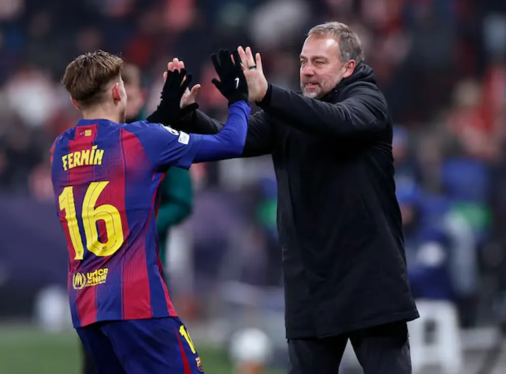 Soccer Football - UEFA Champions League - Slavia Prague v FC Barcelona - Fortuna Arena, Prague, Czech Republic - January 21, 2026 FC Barcelona's Fermin Lopez celebrates scoring their second goal with FC Barcelona coach Hansi Flick REUTERS/David W Cerny