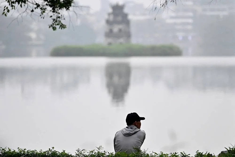 A man sits on the edge of Hoan Kiem lake in Hanoi on March 4, 2024. (AFP)