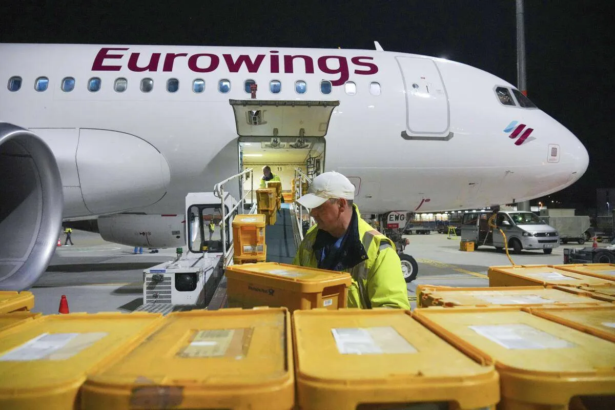 WISAG employees load a Eurowings Airbus A320-214 bound for Stuttgart with plastic boxes full of mail, at Berlin Brandenburg Airport, in Schönefeld, Germany, Thursday, March 28, 2024. (Soeren Stache/dpa via AP)