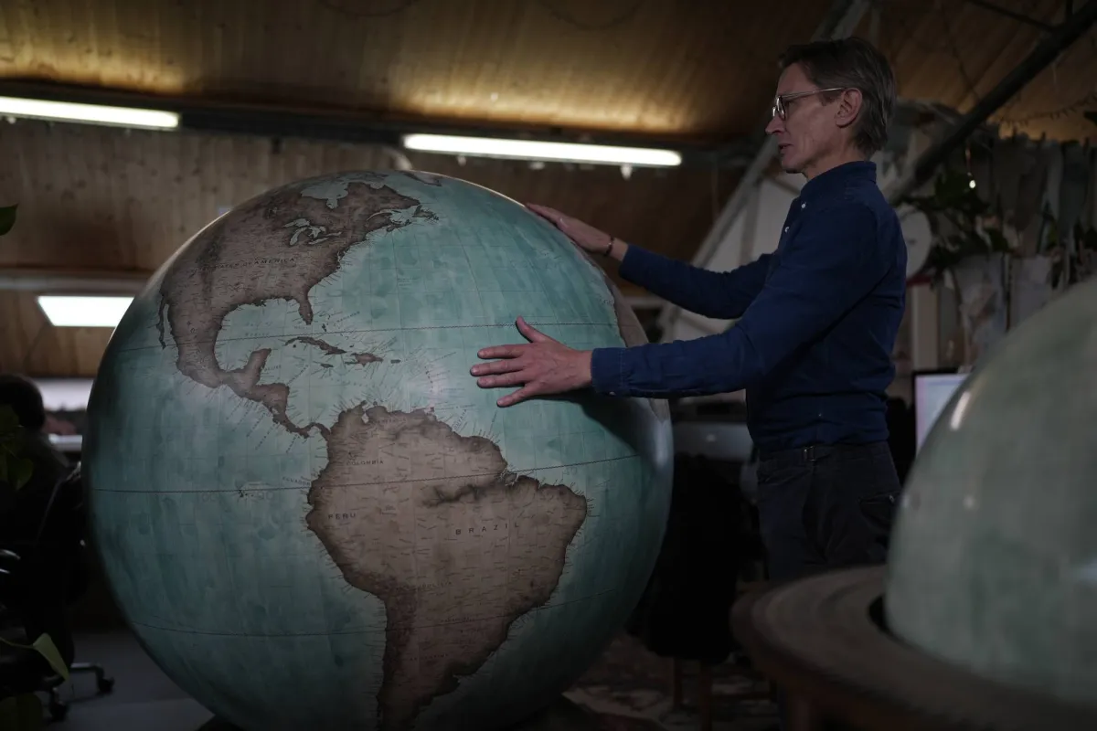 “You don’t go onto Google Earth to get inspired,” Bellerby says in his airy studio, surrounded by dozens of globes in various languages and states of completion. “A globe is very much something that connects you to the planet that we live on.”
