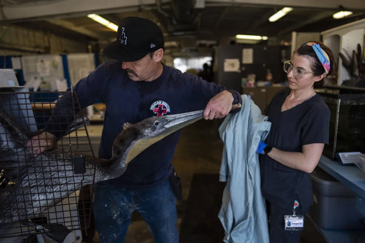 A rescued pelican is removed from a cage as senior wildlife technician Megan Bauer, right, holds a towel to cover the bird for treatment at the Wetlands and Wildlife Care Center in Huntington Beach, Calif., Tuesday, May 7, 2024. (AP Photo/Jae C. Hong)