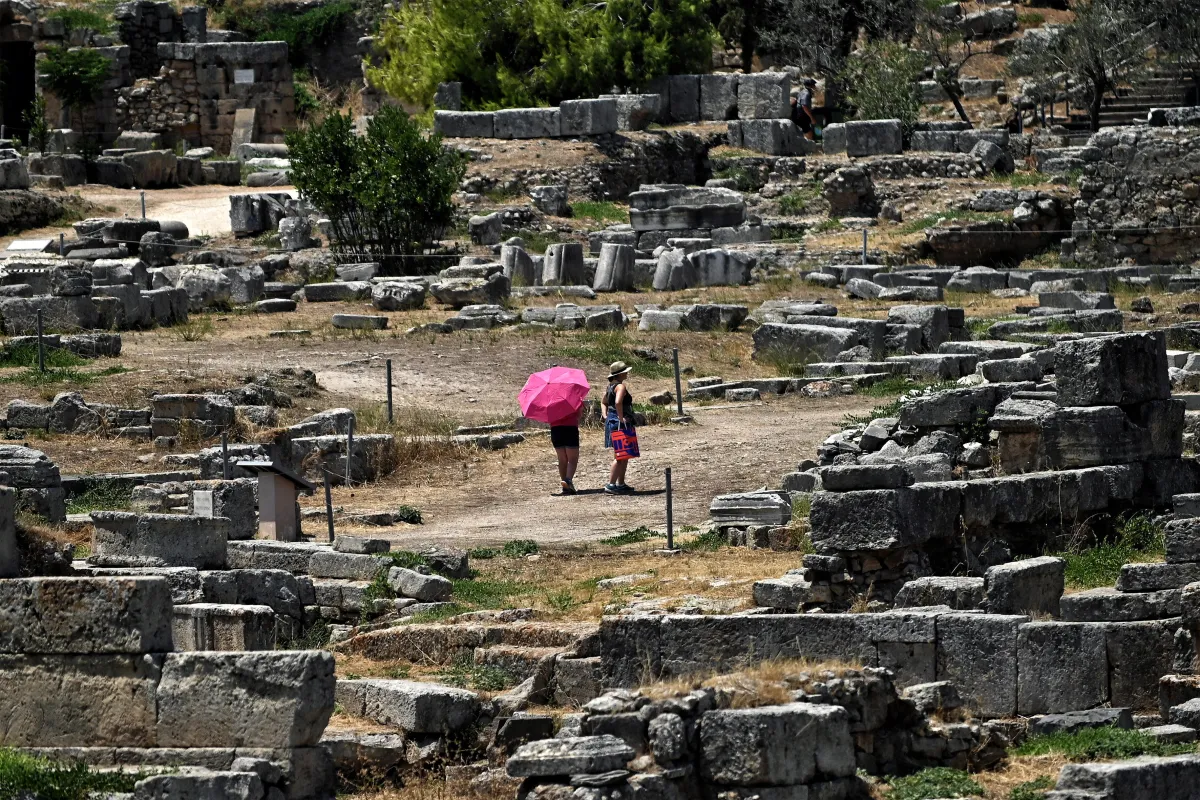 Tourists visit the archaeological site of Ancient Corinthe holding umbrellas, to protect themselves from the strong sun, Greece, 14 July 2024. EPA/VASSILIS PSOMAS