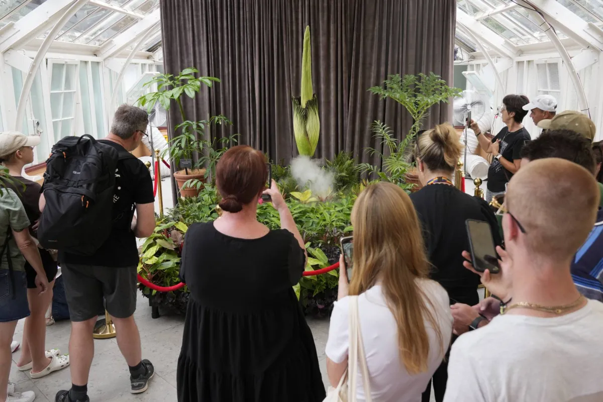 People gather around a corpse flower that begins to bloom at the Royal Botanical Gardens in Sydney, Australia, Jan. 23, 2025, before another has opened in the Australian capital Canberra in the nation's third such unusual flowering in recent months. (AP Photo/Rick Rycroft)