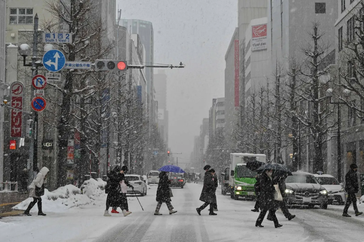 This photo taken on February 18, 2025 shows pedestrians crossing the street in the snow in central Sapporo, Hokkaido prefecture. (Photo by Richard A. Brooks / AFP)