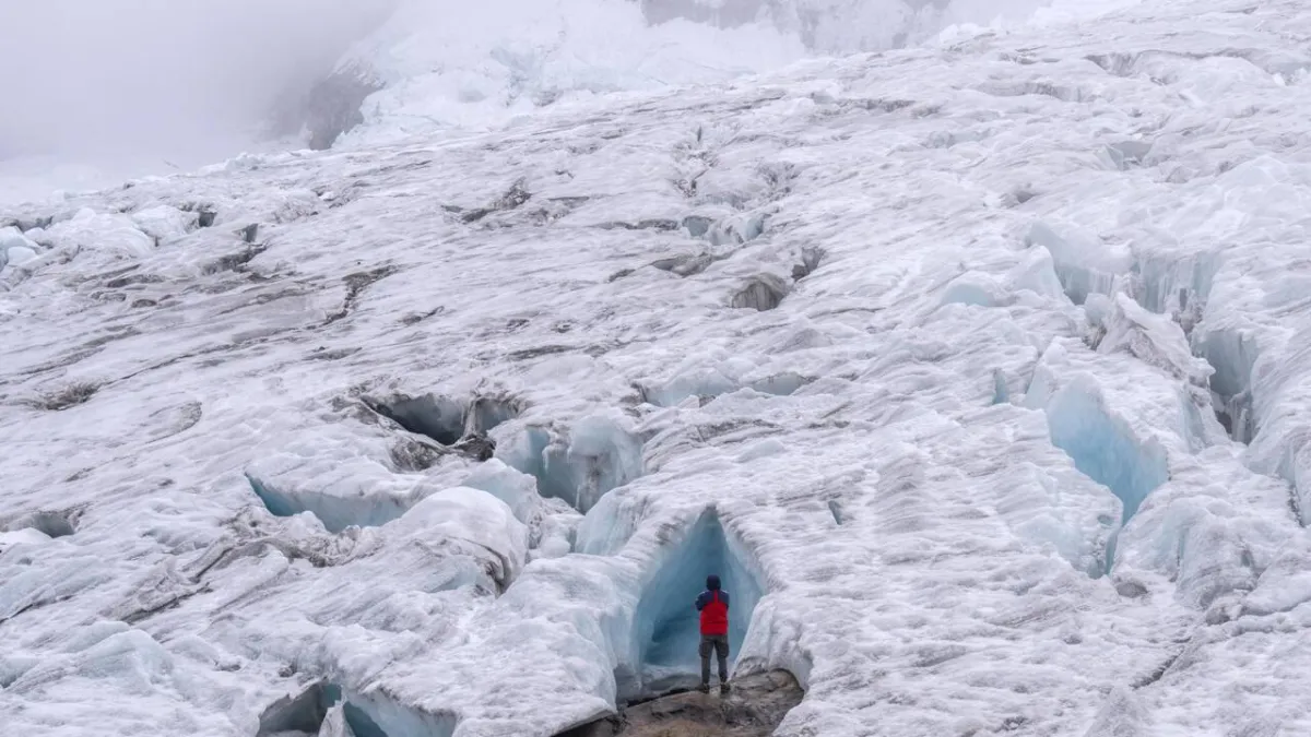A tourist explores the Ritacuba Blanco glacier at the Natural National Park Nevado El Cocuy in Boyaca Department, Colombia, on April 19, 2024. Luis ACOSTA / AFP/File