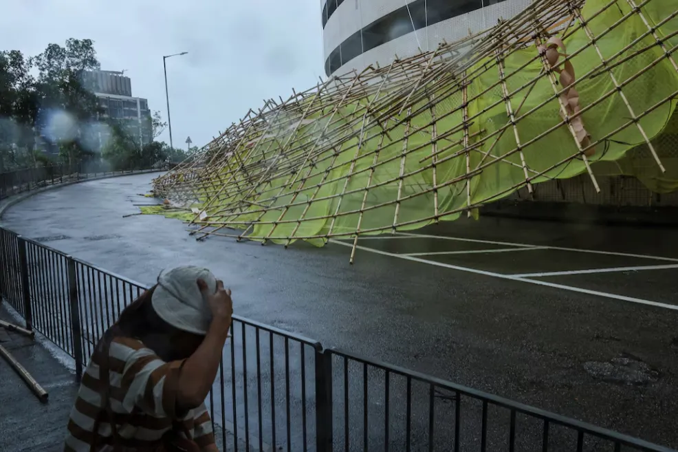Collapsed bamboo scaffolds of a residential building are seen as Typhoon Wipha approaches, in Hong Kong, China, July 20, 2025. REUTERS/Tyrone Siu