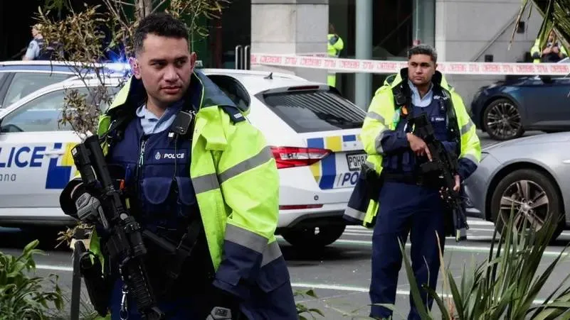 Armed police stand guard in Auckland, New Zealand July 20, 2023. (Reuters)