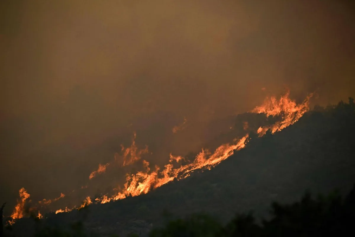 A forest is engulfed in flames as a wildfire rages near Fontjoncouse, southwestern France, on August 6, 2025. (Photo by Lionel BONAVENTURE / AFP)
